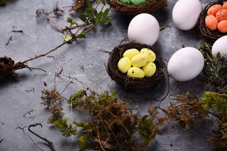 White chicken eggs and bird nests with colored eggs decorated with forest mosses and plants, gray background