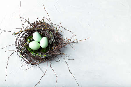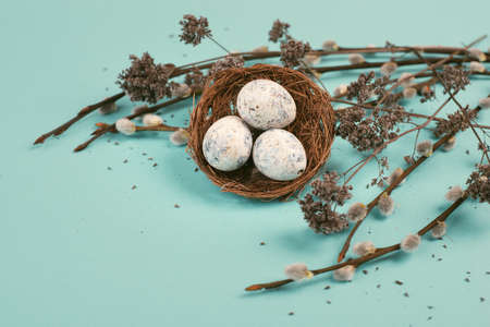 Easter holiday background, nest with small eggs, branches of pussy willow, greeting card, spring season, blue color, copy space for text