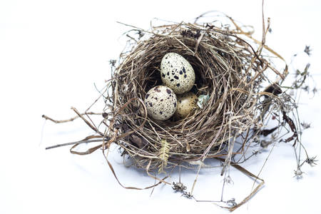 Bird nest with three small spotted eggs decorated with white flowers. Happy Easter holiday celebration