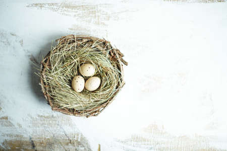 Nest with partridge eggs and willow twigs. Easter composition with a copy of the space