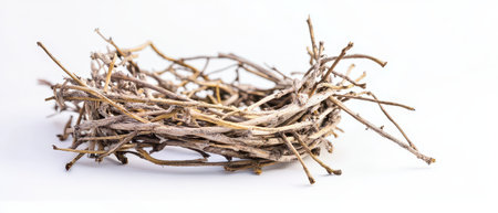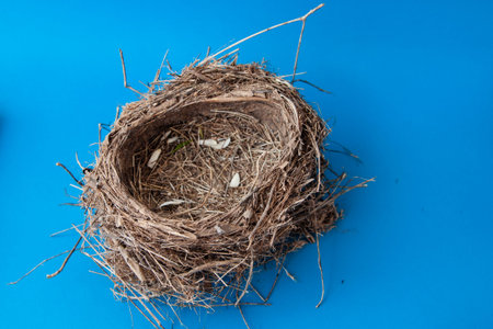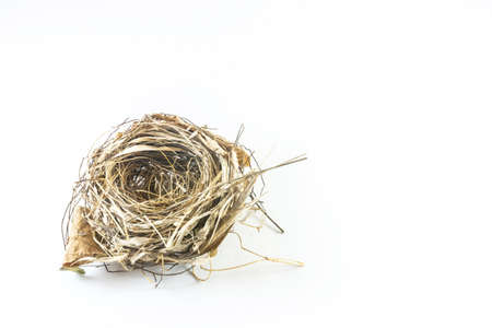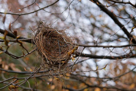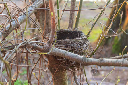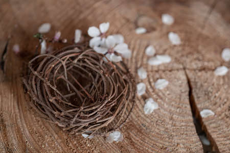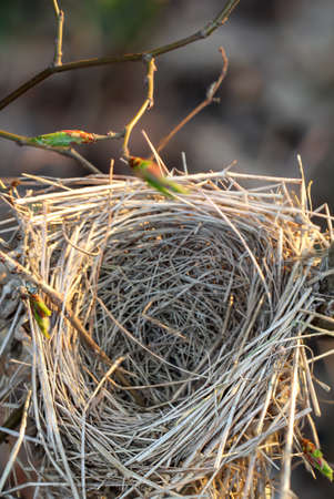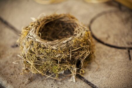 Empty bird's nest on the ground, with unfocused background, and enraged sticks and natural copy space.