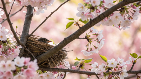 A small bird is nestled in a nest with pink blossoms, set by a peaceful pond under flowering trees.
