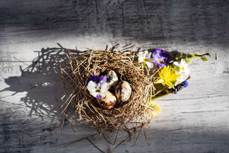 Easter holiday concept with nest and easter eggs on wooden background with copyspace