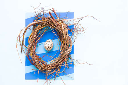 one quail egg in a nest of branches, blue striped background, light blue background for your congratulations, copy space, top view, original Easter card