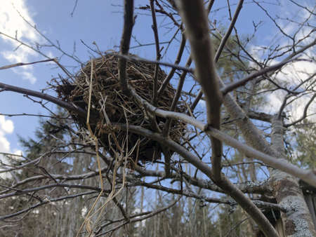 Twisted birds nest on the branches of a tree against the blue sky. Spring