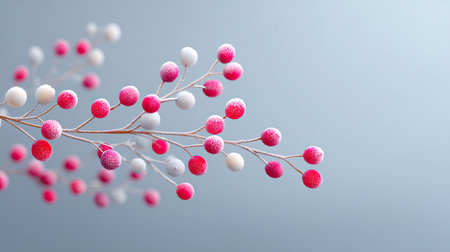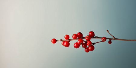 A striking composition featuring delicate red berries on a slender branch, elegantly contrasting with a soft gray background, ideal for nature and decoration themes.