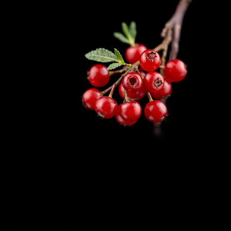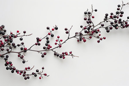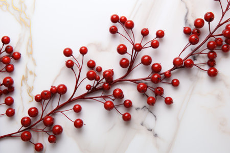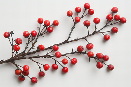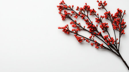 Red berries are elegantly arranged on branches creating a vibrant display on a light colored surface perfect for seasonal decor.