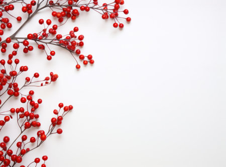 Vibrant red berries arranged on textured white surface, evoking cozy winter feeling. Perfect for seasonal decorations or holiday crafts, these natural elements enhance festive spirit.