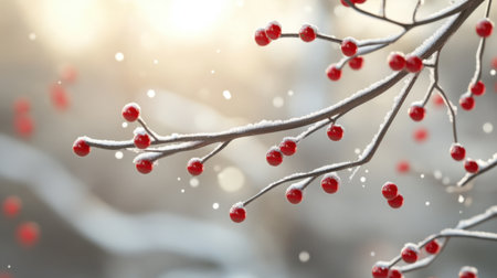 A beautiful close-up of frosted red berries clinging to delicate branches in winter, with soft light creating a serene and tranquil atmosphere.