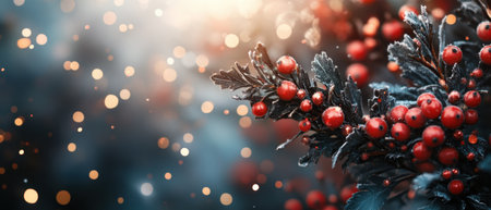 Fresh seasonal launch background features branches with red berries and soft illumination, ideal for festive marketing during the holiday season.