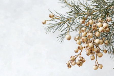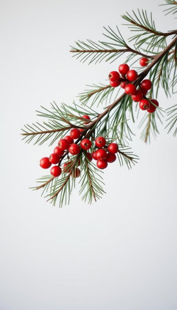 A close up of evergreen branches adorned with bright red berries set against a light neutral background perfect for holiday decor.