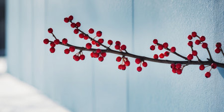 AI Generated. A branch of red berries is frozen and hanging from a blue wall