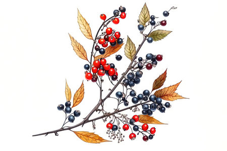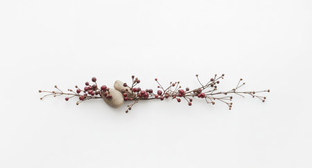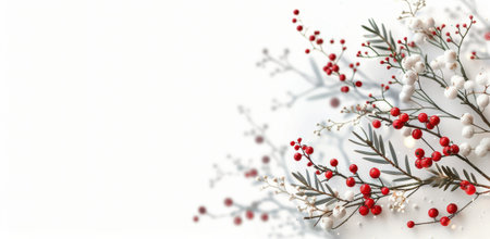 A delicate winter botanical arrangement clusters of red berries and white embellishments alongside sprigs of green foliage, creating a festive aesthetic suitable for seasonal decor.