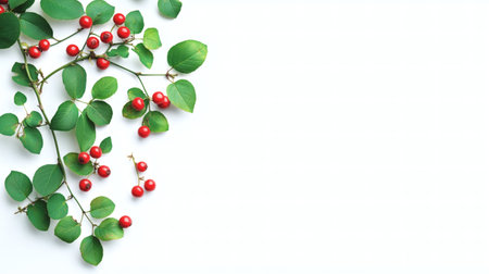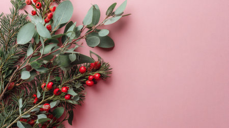 Aesthetic Christmas decoration with green branches, red and white berries and flowers, copy space. Generative AI.