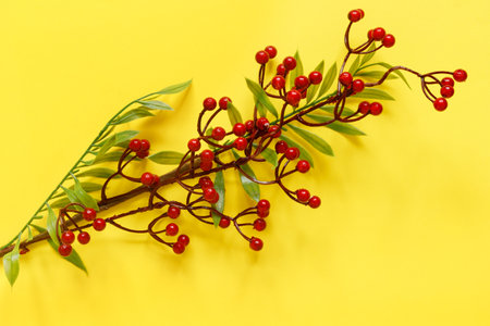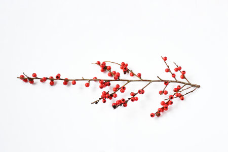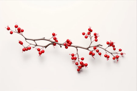 A striking red berry branch rests on a clean white background, perfect for seasonal decorations or craft projects, making it a versatile choice for holiday themes.