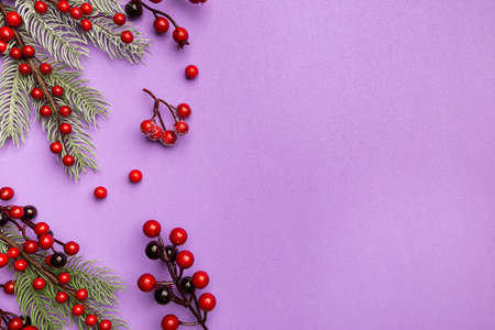 Christmas holidays composition with christmas decorations, red berries branches on purple background with copy space, top view