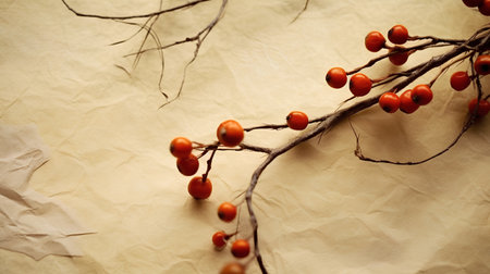 A closeup view of bright red berries growing on a bare branch against a soft blurred background creating a serene autumn atmosphere.