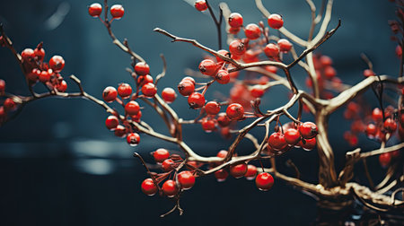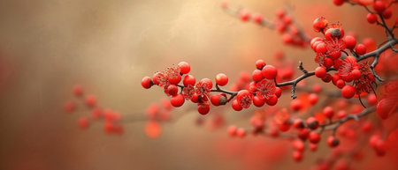 This captivating image features vibrant red berries nestled on slender branches, set against a soft blurred background, evoking a tranquil and natural atmosphere.