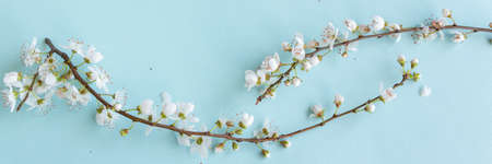 Panoramic shot of flowering apricot branches on a blue background with copy space: spring time concept.