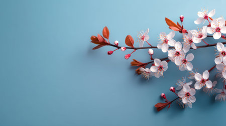 A beautiful arrangement of cherry blossoms on a soft blue background, showcasing delicate flowers and vibrant green leaves, perfect for springtime themes.
