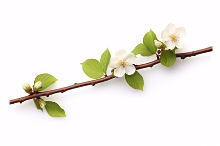 An image showcases an apple branch laden with delicate white blossoms and vibrant green leaves against a pristine white backdrop. The composition is likely studio-lit, highlighting the textures and details. This could be useful for illustrating concepts related to nature, spring, or health in various commercial and editorial projects.