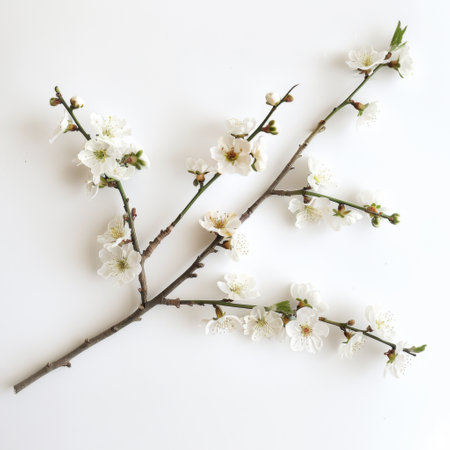 Crossed peach blossom branches with delicate pink flowers, symbolizing growth, placed symmetrically on a seamless white surface
