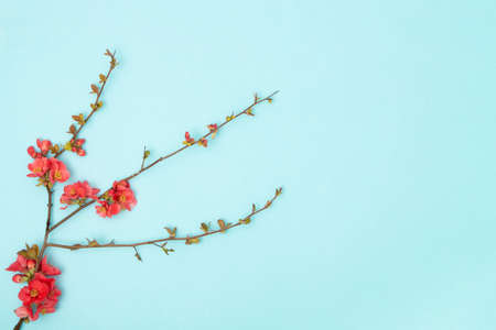 Japanese Quince blossom branches with red flowers. April floral nature and spring blossom on soft pastel blue background. Springtime concept. Top view. Flat lay. Copy space.