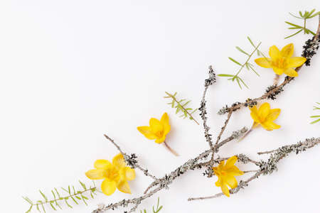 Spring flowering branch on a white background. Flat lay, top view.