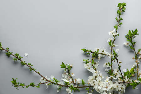Delicate white cherry blossom branches arranged artfully on a soft gray background, creating a serene and tranquil atmosphere ideal for spring themes.