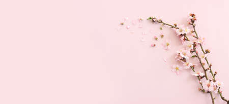 A top view of a lush cherry blossom branch against a soft pastel plain background, creating a serene elegant spring atmosphere