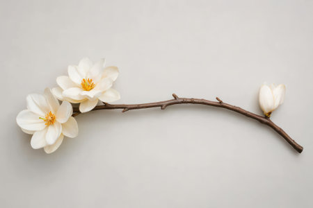 Elegant white magnolia flowers on a branch against a soft gray background.
