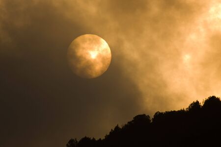Orange sky over the mountains of California. Fires near Los Angeles. Smoke pollution in US air.