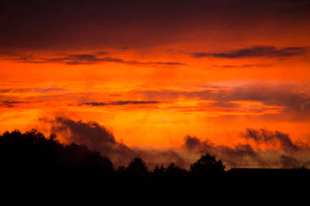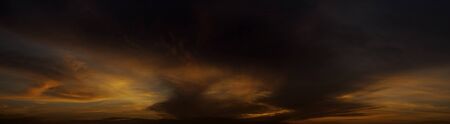 Dark orange sunset sky with heavy stormy clouds in summer