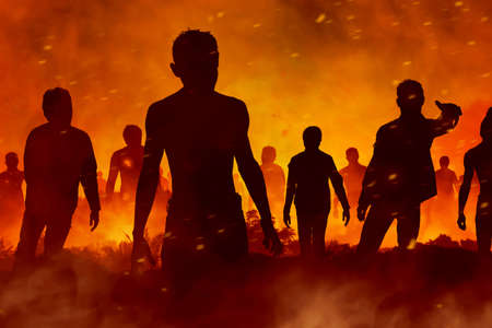 Man with riffle against zombie attack. Zombie apocalypse. Scary view of blurred zombies at the forest and spooky cloudy sky with fog. Horror Halloween concept.