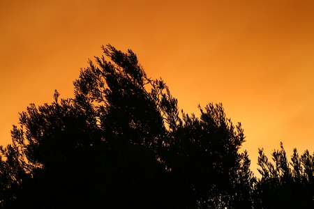 Sunset colored smoke and Olive tree