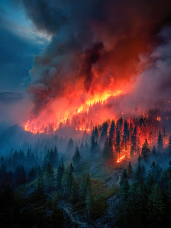 A fierce blaze engulfs rugged mountain terrain, casting an ominous glow as billowing smoke spirals into the evening sky amid smoldering evergreens.