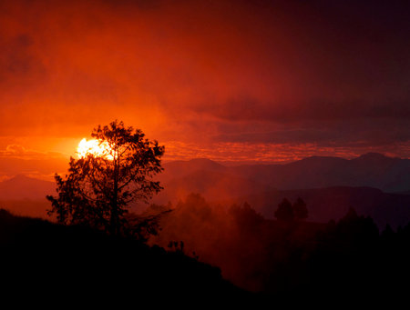 Stunning fiery sunset painting the sky with vibrant red and orange hues, silhouetted trees in the foreground.