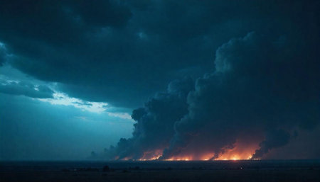 Dystopian landscape featuring fire and dark dramatic storm clouds