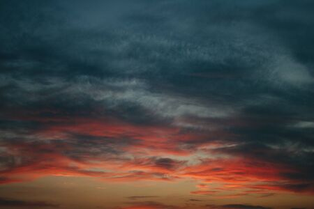 Sky at sunset, gray red clouds closeup background texture