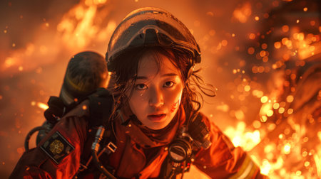 Asian firefighter against a backdrop of fire. Heroic female firefighter confronting a conflagration. Concept of heroic action, emergency service, fire combat, and public protection.