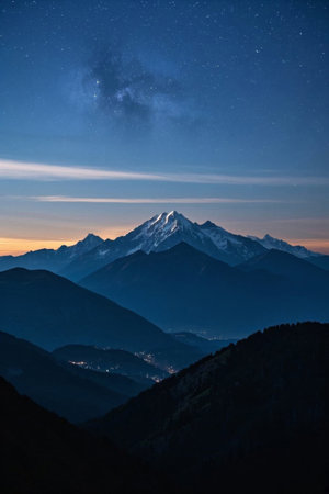 Captivating mountain landscape showcasing elevated peaks under a twilight sky filled with vibrant colors. A serene and peaceful scene perfect for nature lovers.