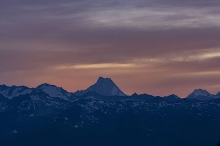 Scenic sunset over the mountain range peaks and summit with colorful magenta and orange clouds.
