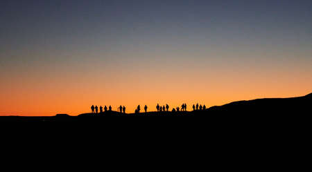 Merzouga, Morocco - December 04, 2018: backlight a lot of people waiting the sunrise