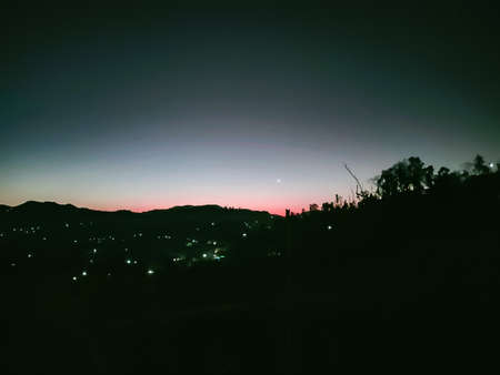 View of moon and star in blue hour before sunrise over the jungle of mountain with tree silhouette