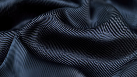 black fabric with interlacing threads close-up. Dark blue tint. Nice beautiful waves on the material. A neatly folded fabric. Interior decoration, sewing clothes and curtains. Textile industry.