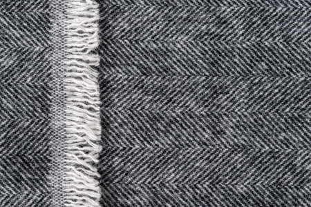 Herringbone wool tweed fabric background with closeup on textile texture and overlapping fringe edge