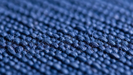 This extreme close-up macro reveals the intricate texture of a deep blue woven fabric. The focuses on the detailed interplay of threads, showcasing the tight weave and the subtle variations in the surface. The rich blue color dominates the frame, creating a visually engaging pattern of interlaced fibers. This abstract representation of textile detail is backgrounds or as a textural in projects, highlighting the fine craftsmanship and the tactile of the fabric.