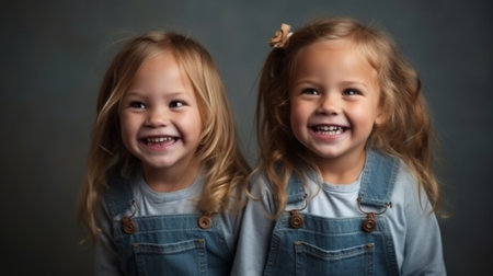 Generative AI : Happy funny girl twins sisters hugging and laughing