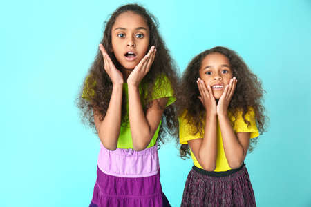 African-American twin sisters. Twins on red background in red turtlenecks.