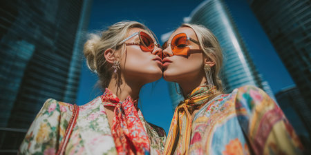 Two modern girls dressed in stylish clothes kiss affectionately on a bustling street surrounded by impressive mirrored high rises. This moment reflects love and equality in an urban setting.